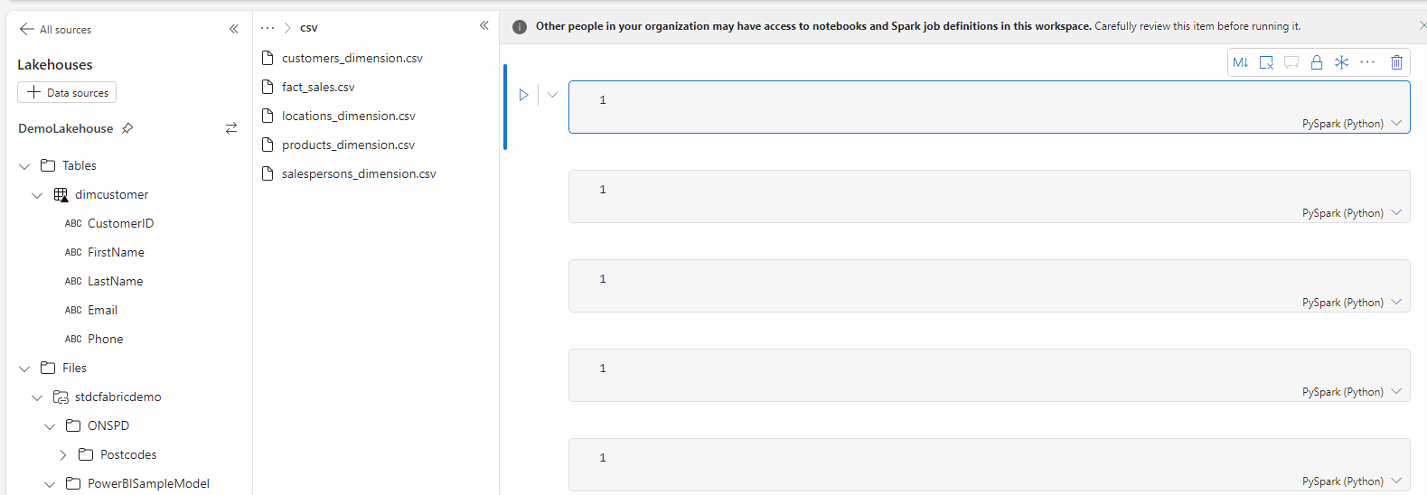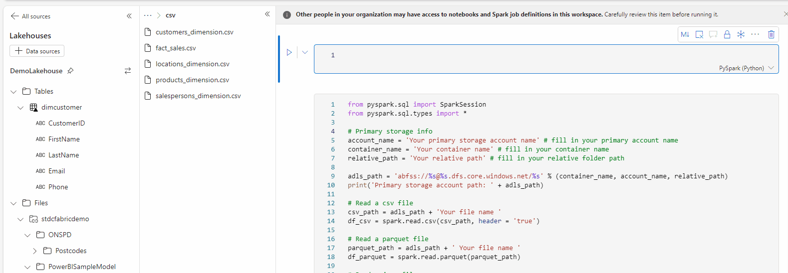 Kielen valinta: Notebookille valitaan kieli aivan kuten Databricksissäkin Notebookin ylälaidasta. Valittavana on niin ikään tutut PySpark (Python), Spark SQL, Spark (Scala) ja SparkR. Myös magic-komennot toimivat tuttuun tapaan, joskin syntaksi on hivenen eri. Esimerkiksi Databricksistä tuttu %py on korvattu Fabricissa komennolla %%pyspark. Näillä voidaan siis muuttaa yksittäisen solun kieli poikkeamaan Notebookin kielestä.